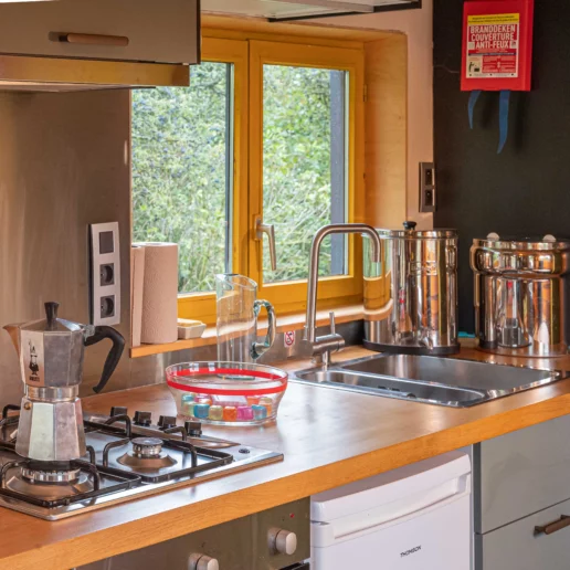 - 💧 Eau de pluie : deux citernes récupèrent l’eau de pluie pour la douche et les deux robinets. (⚠️ L’eau n’est pas potable.)